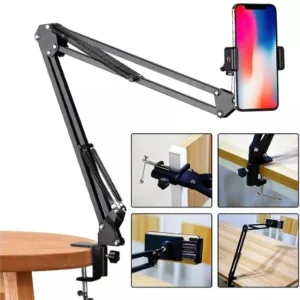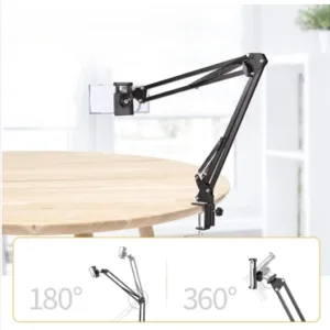 Suporte é ajustável os dois braços São flexíveis, a suspensão da montagem da braçadeira da mesa é completamente flexível e com molas flexíveis e temperadas, firmemente anexável a uma mesa. Os braços dobráveis permitem que você ajuste um ângulo e altura que você gosta para seu celular que é fixado no suporte. Feito de quadro de ferro, suporte do grampo de ferro; apropriado para a maioria dos celulares Você quer ter mais visibilidade e estar com seu celular e fazer suas lives com mais tranquilidade, e a cada momento em um ponto diferente em sua mesa, então este é o suporte de celular ideal para você comprar, pois além de bonito, elegante e com alta qualidade em aço que ele é fabricado. Este braço articulado tem a rotação de 360º da sua base, é flexível e pode ser ajustado no ângulo necessário, esse braço articulado é ideal para a instalação em mesas em casa, escritório ou seu estúdio.