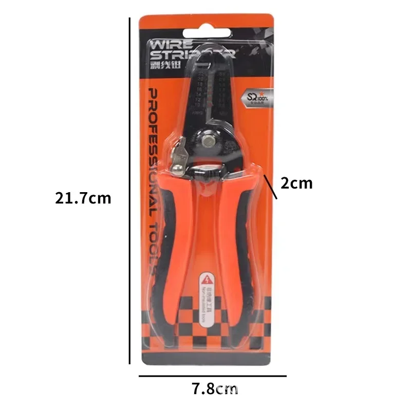A cabeça do alicate apresenta diversas funcionalidades: uma câmara de corte, uma câmara serrilhada com escalas para decapagem, e orifícios para dobrar fios. A ferramenta é ainda equipada com uma mola de alta pressão, que facilita o manuseio, permitindo que o alicate se abra automaticamente após o uso, tornando o trabalho mais ágil.