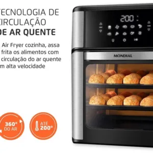 A fritadeira elétrica sem óleo/Air Fryer Mondial Forno Oven AFON-12L-BI é 2 em 1, pois alia as vantagens da tecnologia da Air Fryer ao espaço e versatilidade do forno. Você pode assar, cozinhar e fritar sem óleo. Nas cores preto e inox, ela é fabricada com PP e inox, possui cesto com capacidade de 5L. Ainda tem, 3 assadeiras. Conta com antiaderente Duraflon, onde os alimentos não grudam no fundo. Painel digital com 10 funções predefinidas. Tecnologia de circulação de ar quente: equipada com tecnologia que aquece e circula o ar. O ar superquente envolve e cozinha o alimento, sem a necessidade de usar óleo. Porta com amplo visor + iluminação interna para visualizar as receitas durante o preparo. Acompanha 1 Luva de Silicone e 1 Livro de Receitas.