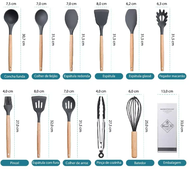 Kit 12 Utensílios Em Silicone E Cabo De Madeira
